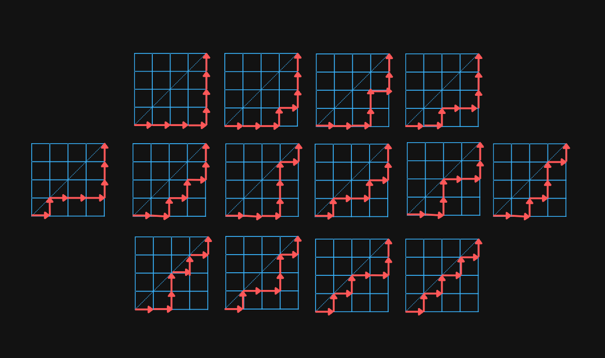 For example, there are C4=14C_4=14 paths in a 4×44 \times 4 grid: